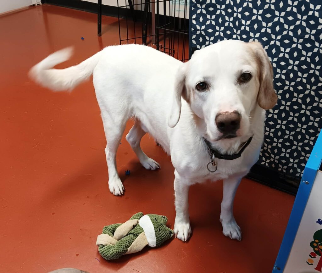 This handsome boy is 7 years old.He has a wonderful temperment,very friendly,playful and loves his walks.He has been given interceptor.He is a white labrador mix.